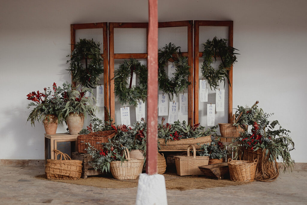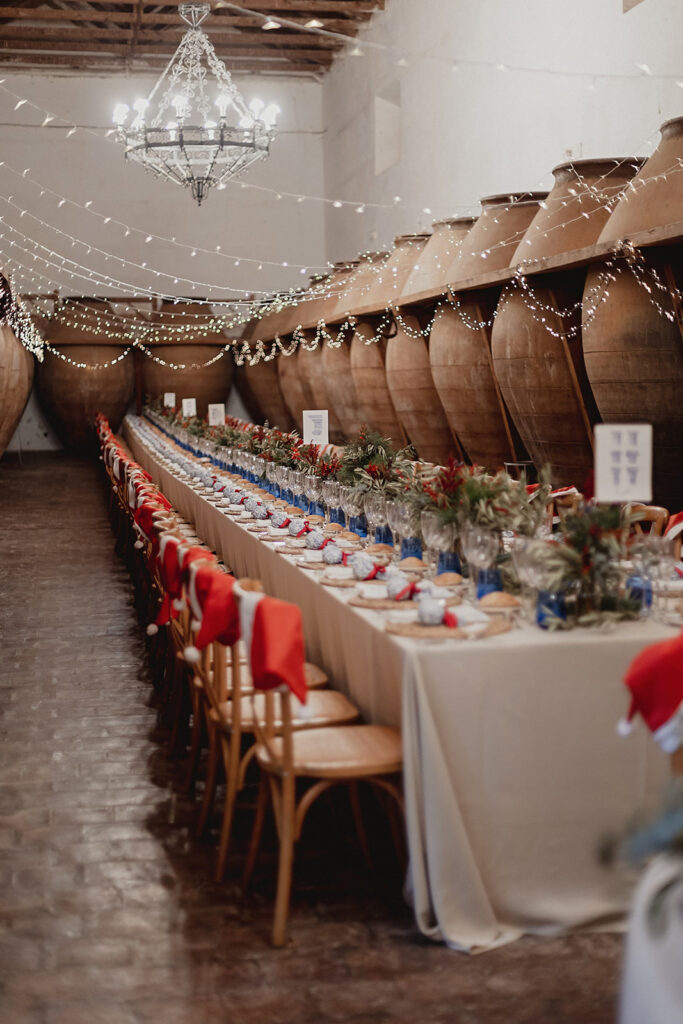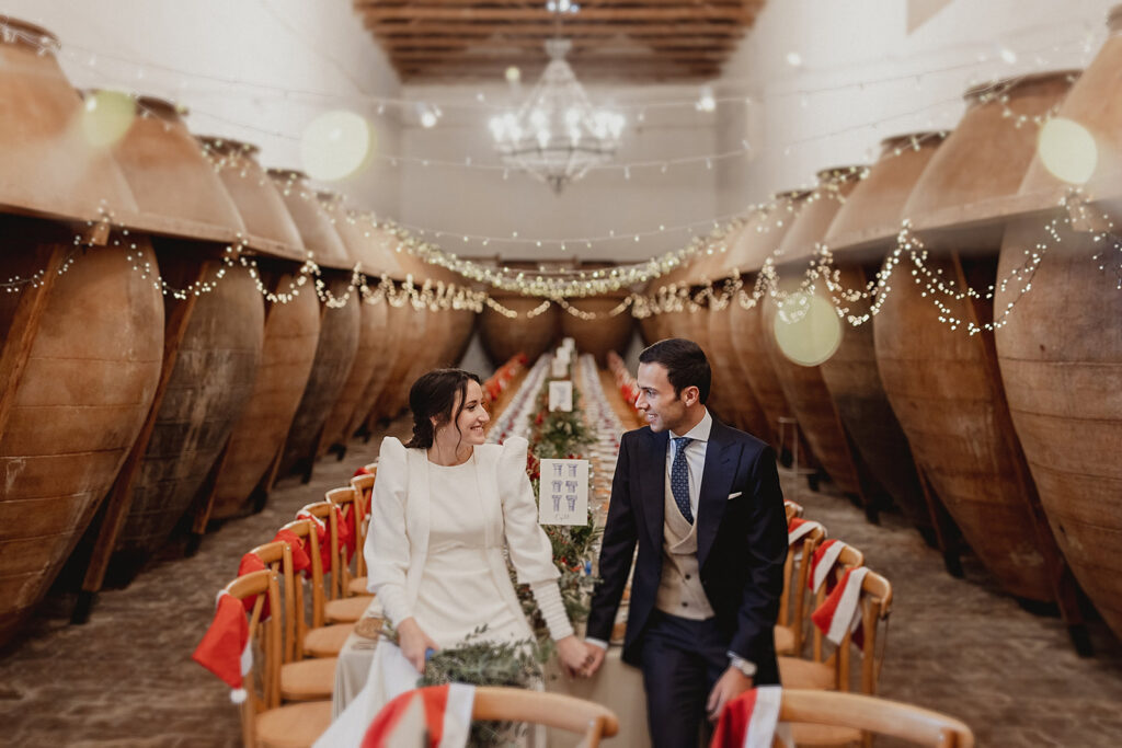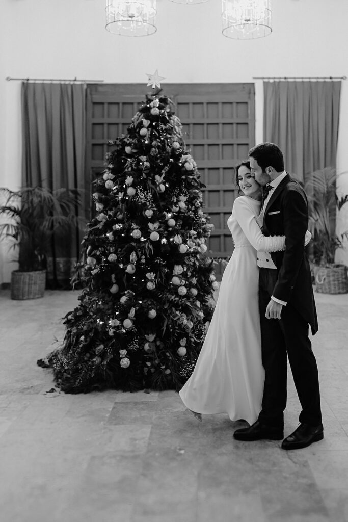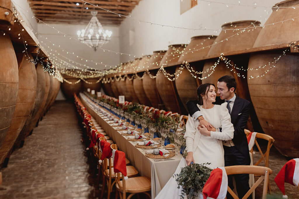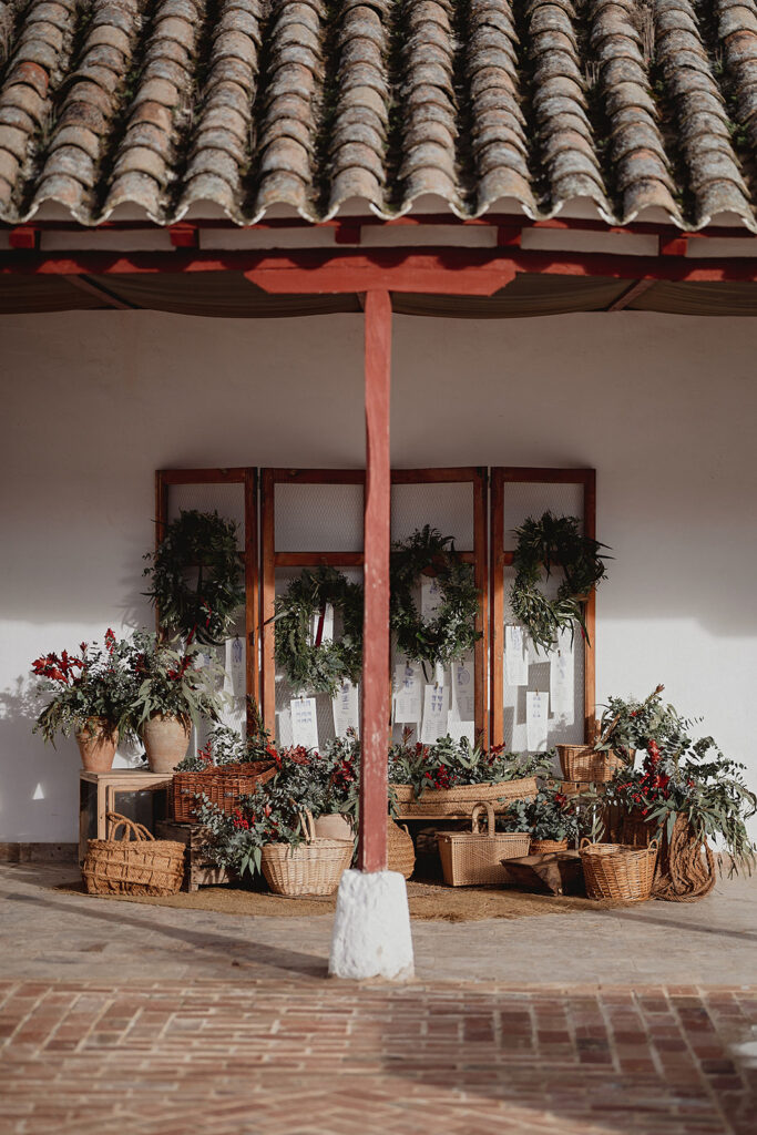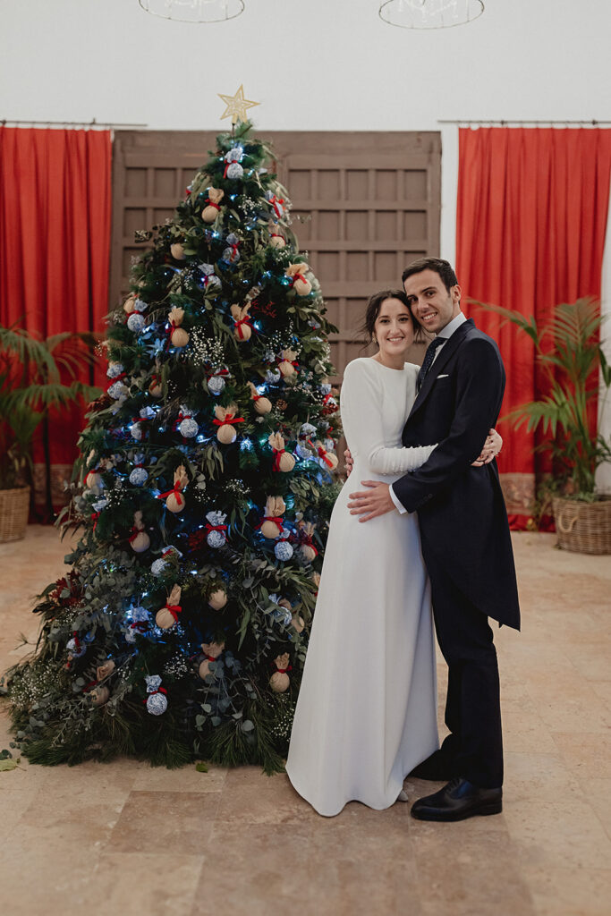 Javier e Isabel siempre habían soñado con una boda con temática navideña. Prepararon toda clase de detalles para su día B, empezando por decorar el árbol que preside nuestro zaguán en este tiempo mágico. La boda en Hacienda la Membrilleja de esta pareja sólo se puede imaginar a ritmo de canciones navideñas, cerca de una chimenea y con un beso bajo el muérdago. Isabel y Javier utilizaron casi todos los espacios cubiertos de nuestra finca. Aquí podéis ver otra disposición, en la que se utilizaron todos los espacios al aire libre, en la boda de Jess + Joseca.