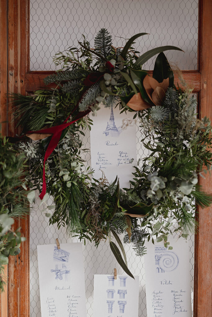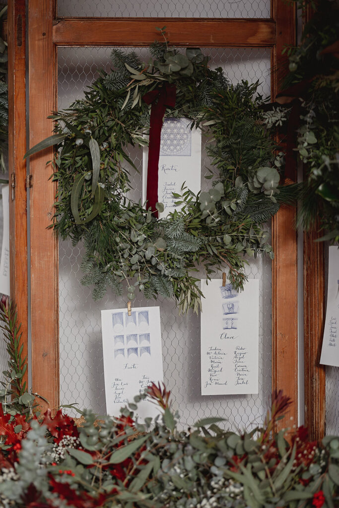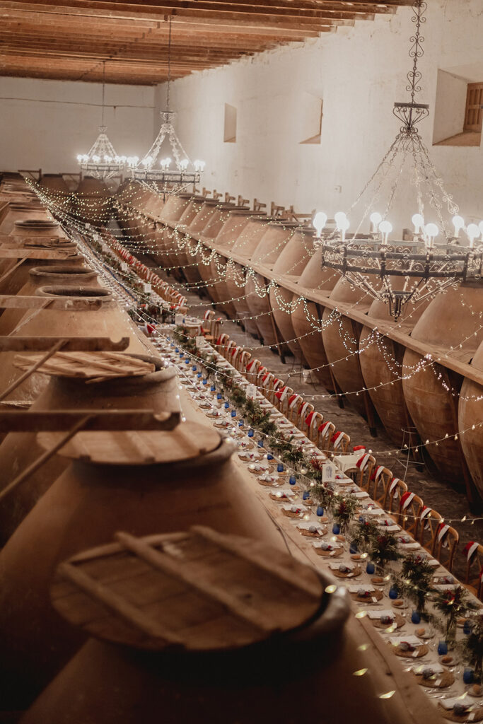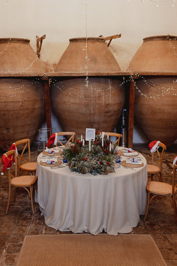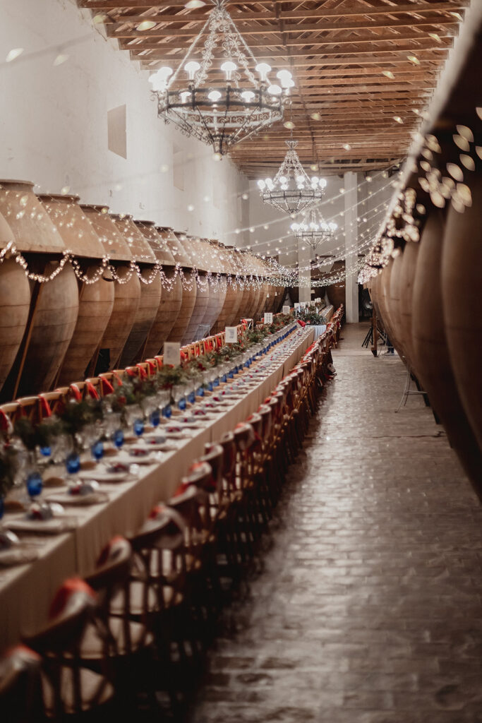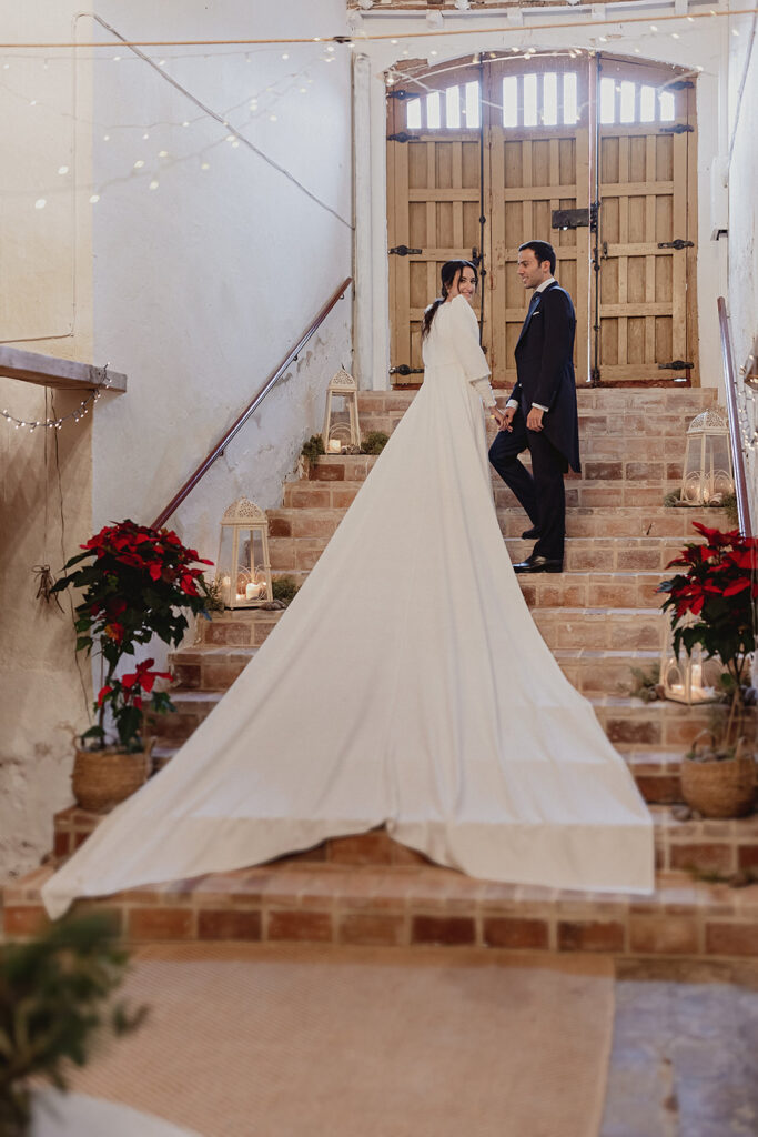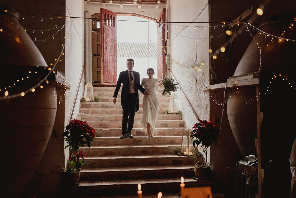 Javier e Isabel siempre habían soñado con una boda con temática navideña. Prepararon toda clase de detalles para su día B, empezando por decorar el árbol que preside nuestro zaguán en este tiempo mágico. La boda en Hacienda la Membrilleja de esta pareja sólo se puede imaginar a ritmo de canciones navideñas, cerca de una chimenea y con un beso bajo el muérdago. Isabel y Javier utilizaron casi todos los espacios cubiertos de nuestra finca. Aquí podéis ver otra disposición, en la que se utilizaron todos los espacios al aire libre, en la boda de Jess + Joseca.